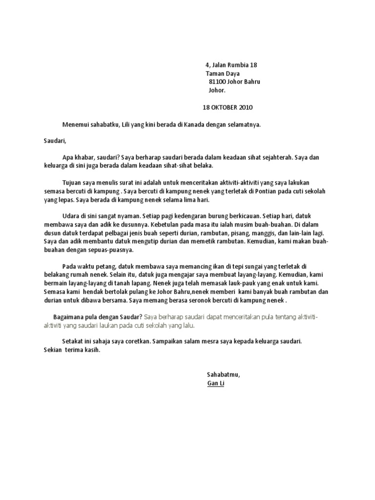 Tulis sepucuk surat kepada sahabat pena anda di luar negara untuk menceritakan pengalaman. 19 Contoh Karangan Surat Kiriman Tidak Rasmi Pengalaman Bercuti Di Kampung Pictures. Pengenalan sikap-mempunyai banyak kawan dia sangat.